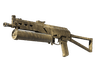 The Bizon SMG is low-damage, but offers a uniquely designed high-capacity drum magazine that reloads quickly. It has been spray-painted using short pieces of tape as stencils.